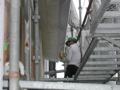 小石を混ぜた塗料を外壁に吹き付けて行きます。 考えれば考えるほど色使いに迷ってしまいましたが、思ってた以上に 良い仕上がりで、大変満足しています。 |